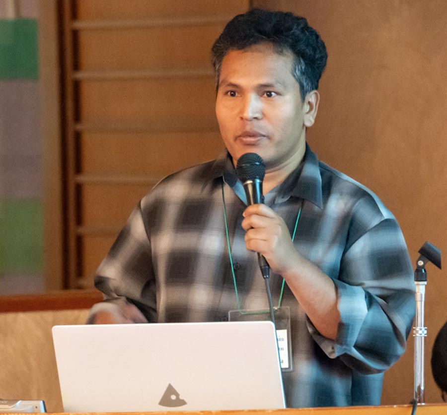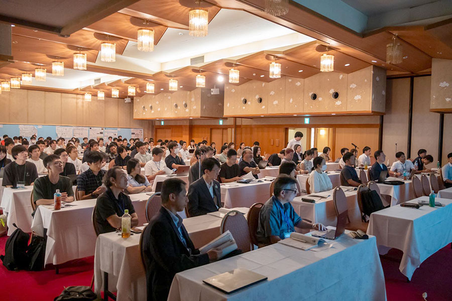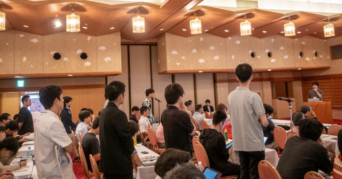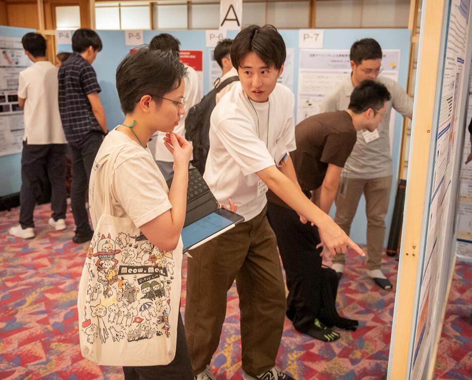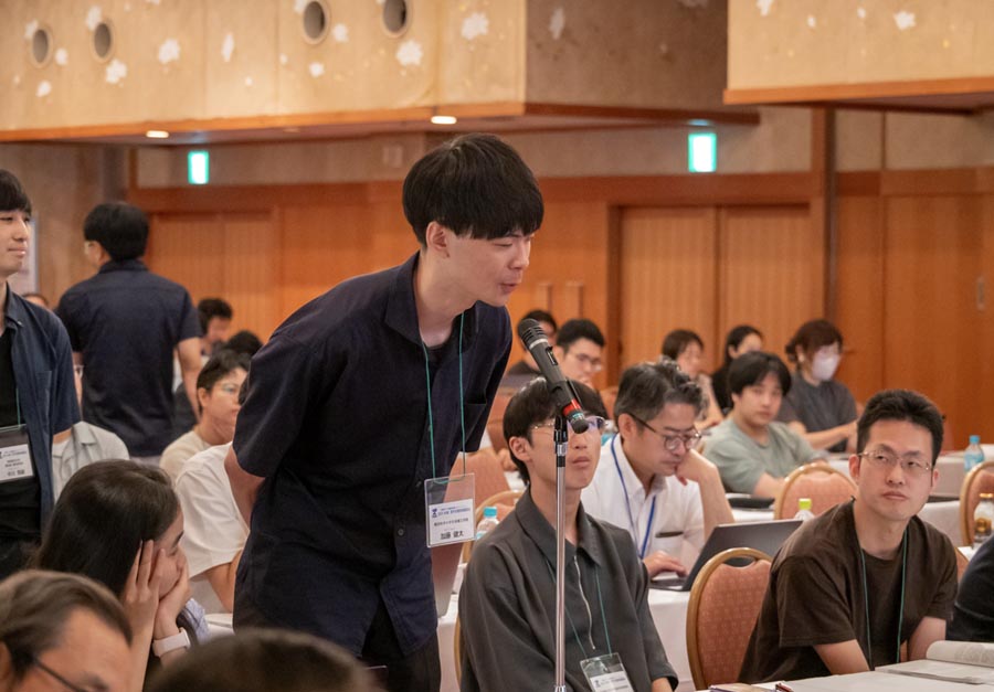 初日は到着後すぐ、一部の参加者は荷を解く間もなく講習会に突入。今年も「発表時間を短めに、質疑応答を十分に」というスタイルで進行しました。例年通り、発表後には質問者の列ができ(この会の名物です)、設定時間では収まりきらないほど白熱した議論になりました。話し足りない内容は、会場後方に掲示されたポスターの前で、いつでも続きを話せる仕組みになっており、これも合宿形式ならではのメリットでした。ポスター会場も大盛況で、熱心に説明する姿や議論する光景があちこちで見られ、まさに熱気で室温が上がるほどの活気でした。一昨年から始まった恒例企画「きっかり3分間トーク」では、ポスター発表者の中から選ばれた11名の若手研究者が、3分以内のフリートークに挑戦。持ち時間ぴったりで、次々とハイレベルな発表が繰り広げられました。